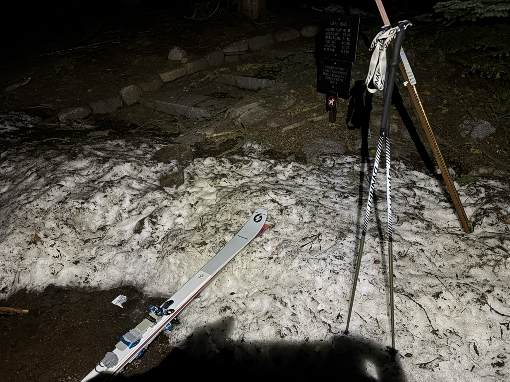 I started at 11pm from Wolverton in full darkness, no moon, no ambient light, just a headlamp doing its best 75-meter impression of daylight (realistically 30). The west side immediately demands more attention: dense forest, random posthole highways, and just enough snow to make you question every decision. Skins, it turns out, work great on dirt, rocks, and pine needles…Pomoca just hasn’t marketed that yet.