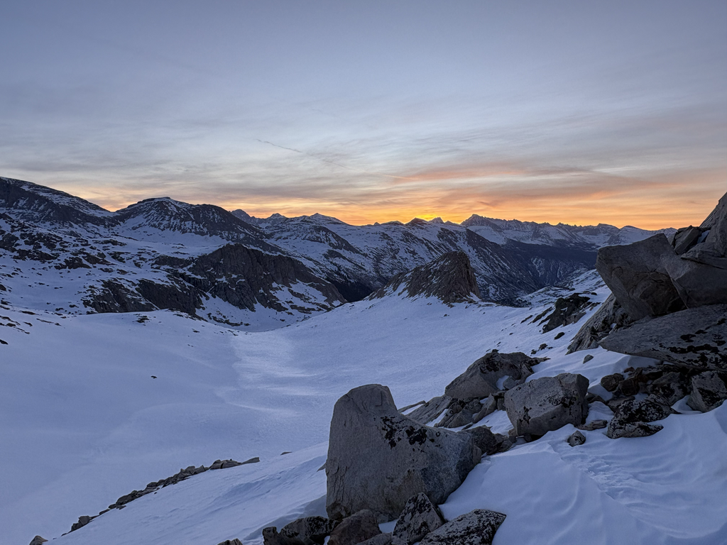 Triple Divide, No Name, and Milestone all moved well, despite strawberry fields of runnels everywhere. Milestone Pass delivered a mix of rock scrambling, snow was much lower than in past years. I’ve climbed Milestone plenty from the east, but hadn’t skied it towards the Kern. It’s exposed, with hidden rocks and just enough steepness to matter. A fall here would be bad, so I’d be lying if I said there weren’t some nerves dropping in.