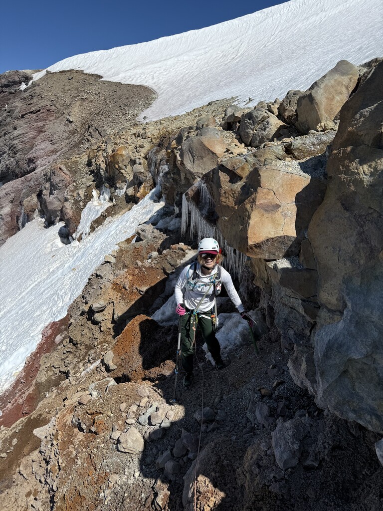 Transitioning took a minute, since we opted to gear up all at once—harness, rope, helmet, axe, crampons. Snow conditions were ideal: secure, crampon-friendly, and generally awesome. Snowbridges were solid, though a few crevasses near the pumice ridge/saddle with Colfax were open and overhung, requiring a little leap—but it all felt 100% fun. We passed one party descending from the pumice ridge, but otherwise had the Coleman-Deming route to ourselves.