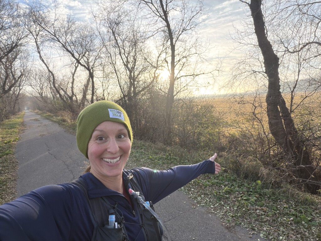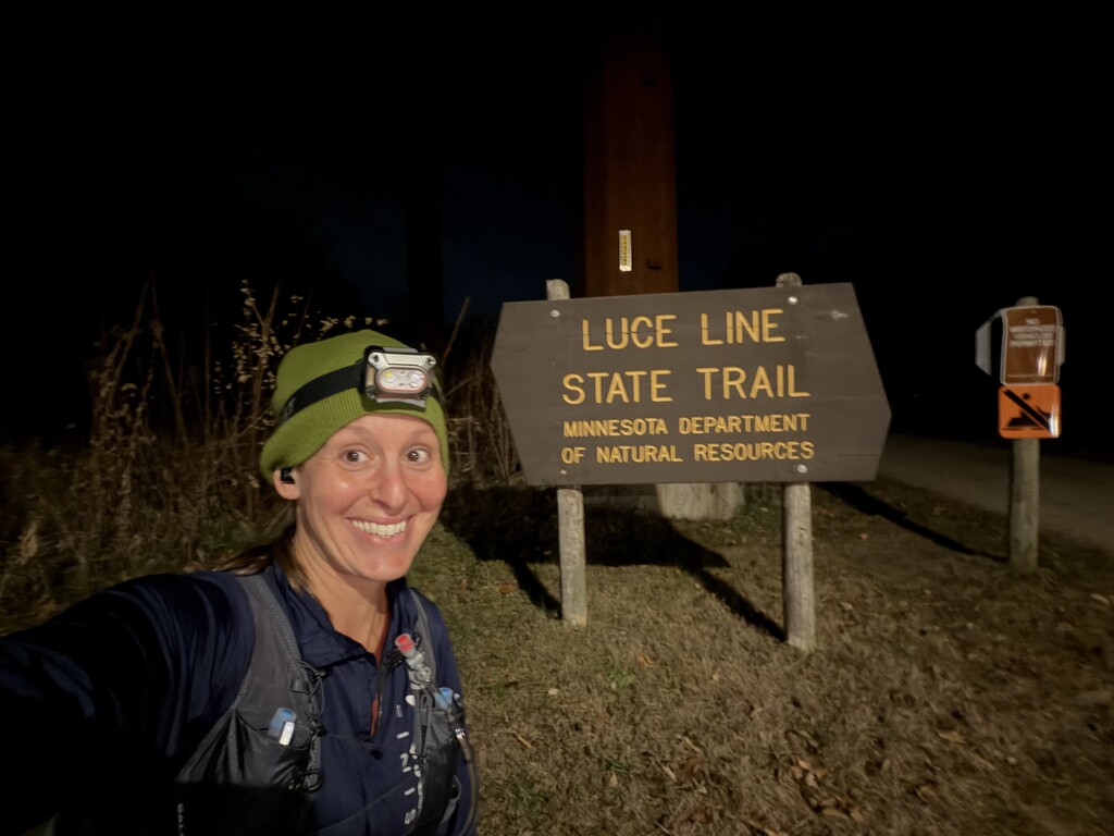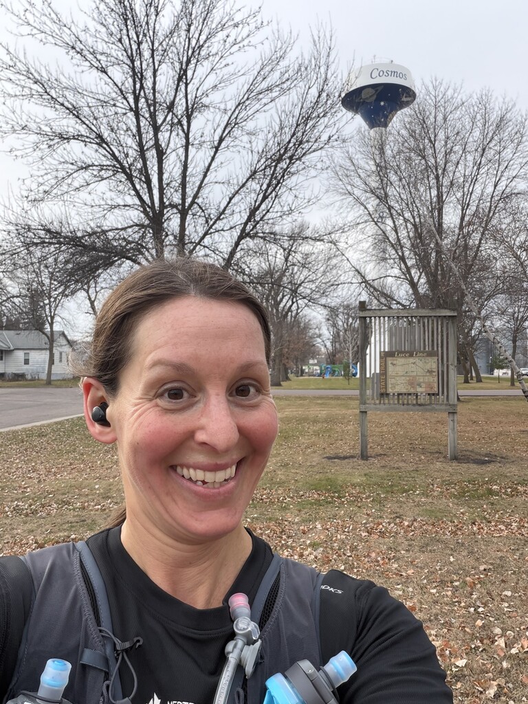This was quite an adventure! Going self-supported was a great reason to finally buy a new running vest. I went with the Salomon 15L and Osprey 3L bladder. I overpacked bigtime and it was heavy. BUT I'm so glad I did because my first planned stop in Watertown was a fail! Turns out the 24 hour Speedway is actually a closed-at-night Marathon LOL. So I kept running through the woods. I saw many pairs glowing animal eyes -- and only one pair seemed to belong to a dire wolf! The highlight was seeing a beautiful barred owl. I had more than enough food and water to make it 40 miles before finally getting to Silver Lake. Giant snickers bars, ritz crackers, and pink Red Bull were my jam. Reaching Hutchinson was exciting! After that, it was a grind and I was so excited when I saw the Cosmos water tower in the distance.