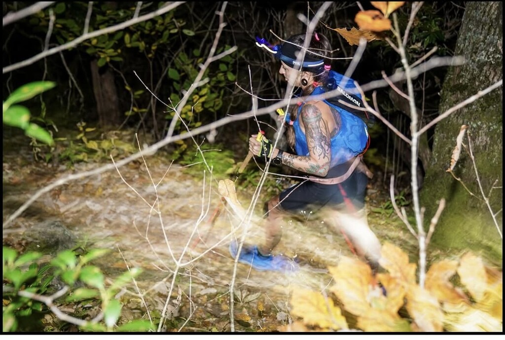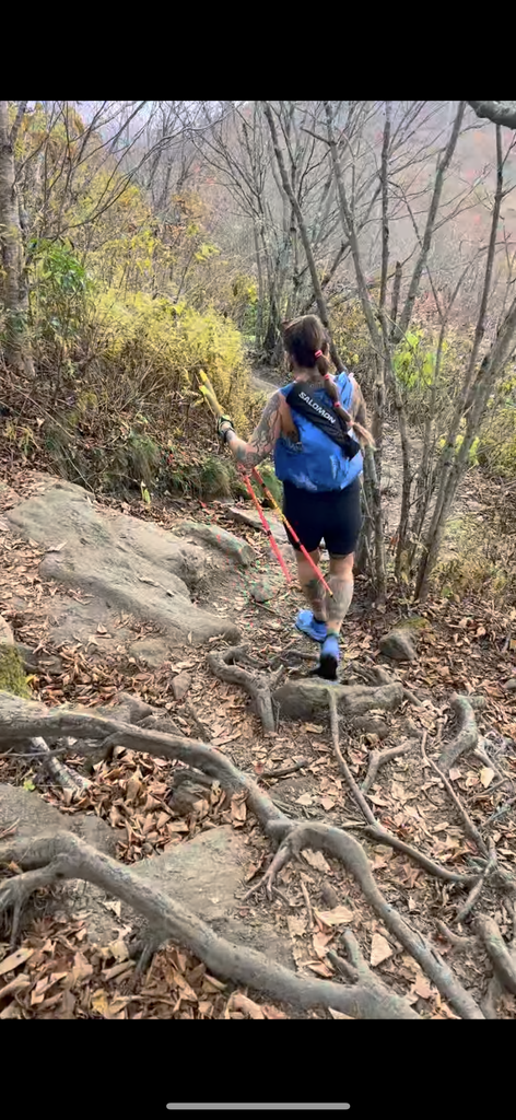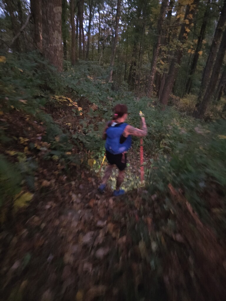 I felt like a whole new person. I did not take more caffeine yet here as it was still early. I probably could have, but just that little reset was enough. Off we went on our huge side quest. Cold Knob first. First up the backside, a short steep climb to the top. Then descend down a very technical steep trail. It is around 1.5 miles-ish long with about 1,100 feet of gain. A local fave to get all the vert for climbing. As we went down we quickly realized it would be leaf surfing most of the way, which added a whole new element. The only thing we could do was laugh at the stupidity of doing this section at these miles in the dark. It kept us going. Do not tell anyone, we both secretly enjoyed it. We got to the bottom, did our turnaround, and up we went. Steady is strong, steady is strong, I kept repeating. I was in good spirits and mentally I had prepared myself for this section all through training. I was ready. I was ready to bring it and that we were. It was not going to let this loop crush me and it did not.