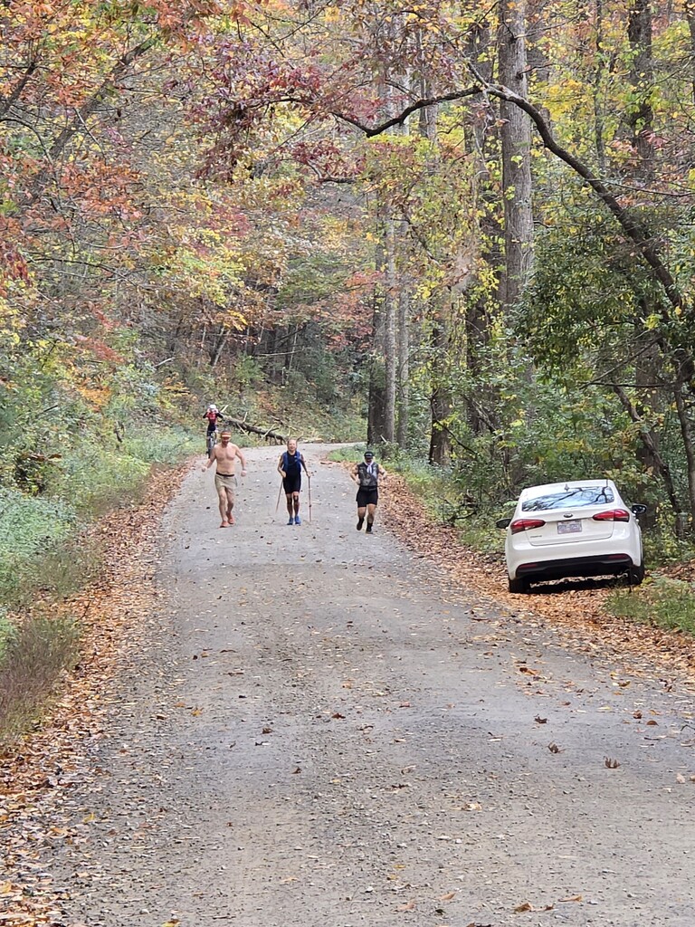 We made our way back to Bent Creek Gap Road and saw the crew. We did not stay long here, got some banana bread to go. I think at some point I took another caffeine pill. I do not quite remember this, but I remember feeling a spark of energy that only a caffeine pill could bring at this next little bit. I took an extra charging block and charged my watch going down Bent Creek Gap Road. It is an easy forest service road, so I could concentrate on not tripping and charging. My pacer was getting sleepy here, so he did a little sleepwalking himself. We were about to head up Greenie, which is another climb, steeper than Cold Knob. Not many people do this one, but those that do are another breed.