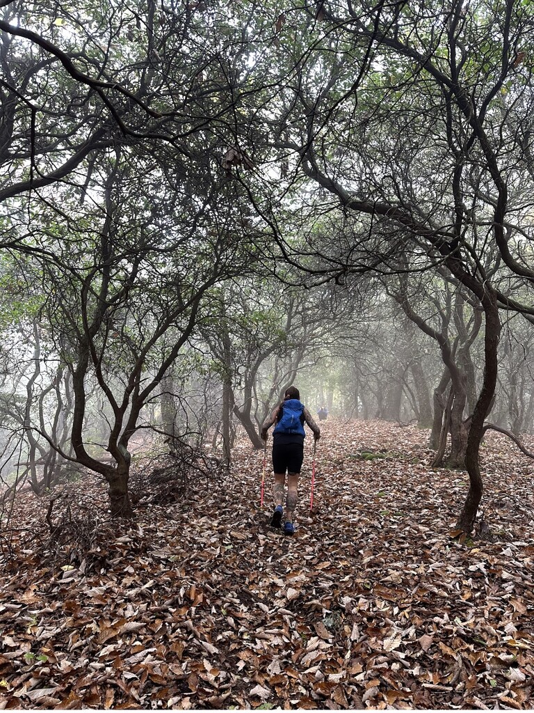 A pack repacked, new gear, and a new pacer, Nate, we set forth on what would be the toughest section. My pacer here knows me. He has paced me for every race. A best friend, a training partner, and an incredible athlete. He was the only one I wanted for these miles. I knew I would need his energy. Off we went to the first of many side quests off the MST. First up, Pilot Rock, yes we hit two different Pilots this run. To do this we do a punchy climb then a full descent. This is where the weather started to have fun with us. It got extremely windy and we were in a cloud. The fog was so dense it was hard to see. Perfect timing because this trail is notorious for its rock gardens and small loose rocks. I joked I needed fog lights because the headlamps were making it worse. Gaining any speed down here was not going to be possible. We hit the turnaround and headed back up. We did go slightly off trail here, but not much, only about 10 feet. We took a random camping trail to a fire pit instead of the trail. We quickly realized that was not the way and backtracked and got back on the trail easily. Up we went, back into deep fog and wind.