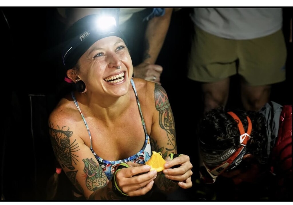 My rockstar crew took my socks off and there was a blister starting to form. We taped it up and switched socks. I enjoyed more oranges and more laughs while we were doing this. Pete captured one of my favorite pictures here. My smile holding an orange while my crew was taping me up was perfect bliss. Until then I had a sports bra on. It was planned to put my wide shoulder tank top on here over it, which we did. Again, I run hot, so even though it was chillier I knew once I got going I would not need gloves or a long sleeve. The headband I had for my headlamp was even too hot but it was needed. I did have a waist lamp the entire time as well.