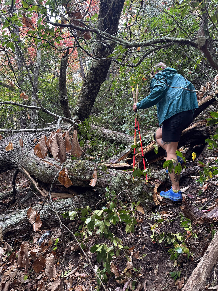 I had to refill some things and take out trash. Our pit stops had become a well-oiled machine. Not changing much, it became muscle memory of what needed to be done. I gave my waist lamp back. I kept my headlamp for no reason but I forgot to get it out of my pack. We got a little charge on my watch while we did a quick pacer regroup. We had two side quests before continuing on MST. First up, Sleepy Gap. Some would call this a pointless out and back and it felt like that in the moment. But sticking to keeping this route special to us locals, this is Victor’s trail. A legend in our trail running community and our trail maintenance. This was his trail. He rebuilt this trail, took pride in this trail, and we all know that his love was soaked into its soil. He passed away this year from cancer. So what may look like why would you do this, to me, it was the only way. A remembrance to Victor. I climbed and shared stories with my pacer. I spoke his name. I shared his legacy with her as she is newer to the ultra world. I was really starting to hallucinate here, seeing dump trucks, construction equipment, and a car in the woods. It turned out to be just three big boulders. After we got back to Sleepy Gap parking lot it really was starting to rain. I put my rain jacket over my pack and up Grassy Knob we went, another local fave for repeats to get vert. We went up the backside to hit the summit then all the way down to the bottom.