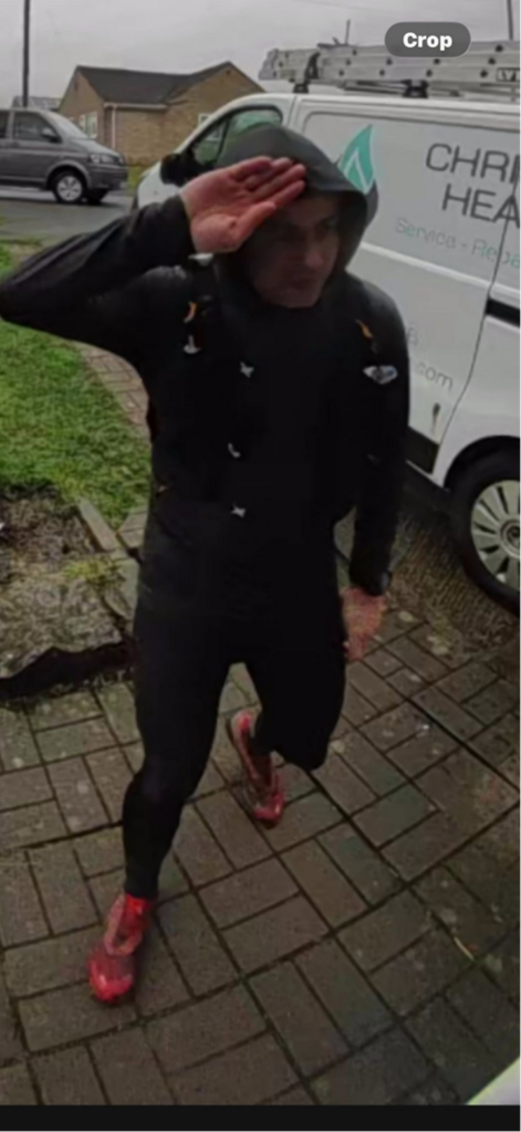 Door bell footage of the Bird residence caught me saluting his son George. We arrived as all three lads were off to school which made for some good banter. Liz sorted us out with some hot soup, noodles and coffee. A quick change into shorts, fresh baselayer and socks(talc’d feet) for the oncoming heat of the day was a winner decision.
