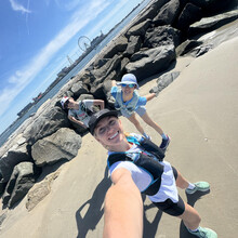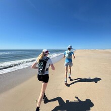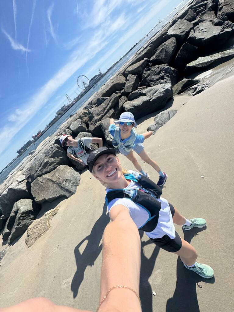 The first five miles were completely quiet and solitary (aside from the pod of dolphins we gleefully watched swimming alongside us for a few minutes), but not long after, we began encountering people along the beach and spent the next 10 or so miles limboing beneath fishing lines. We fueled with a 100 cal gel every four miles for the first 20 miles but eventually switched to the other snacks we’d packed—Uncrustables, salt and vinegar chips, and beef jerky. Each of us had packed about 1-2 liters of water, which proved to be insufficient, so we made use of public restrooms along the way to refill when possible. Knowing it was going to be a hot and long day, we took some high electrolyte gels (up to 400 mg of salt) and added electrolytes to our water.