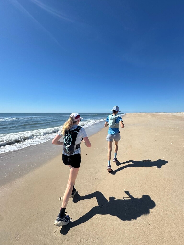 We began the day with a boat ride from Ocean City (thank you to Paul from Under the Bridge Watersports) out to the rock jetty at the northern tip of Assateague and began our run around 9:30am. With an estimated finish time of 5–6 hours, we had planned around the low tide at 12:30pm, which we expected to hit around or slightly before the halfway point. Each of us carried a 10-12L trail running vest with 1-2 liters of water, 8 gels, and an array of sweet and savory snacks.