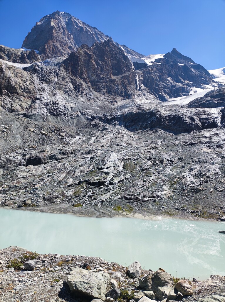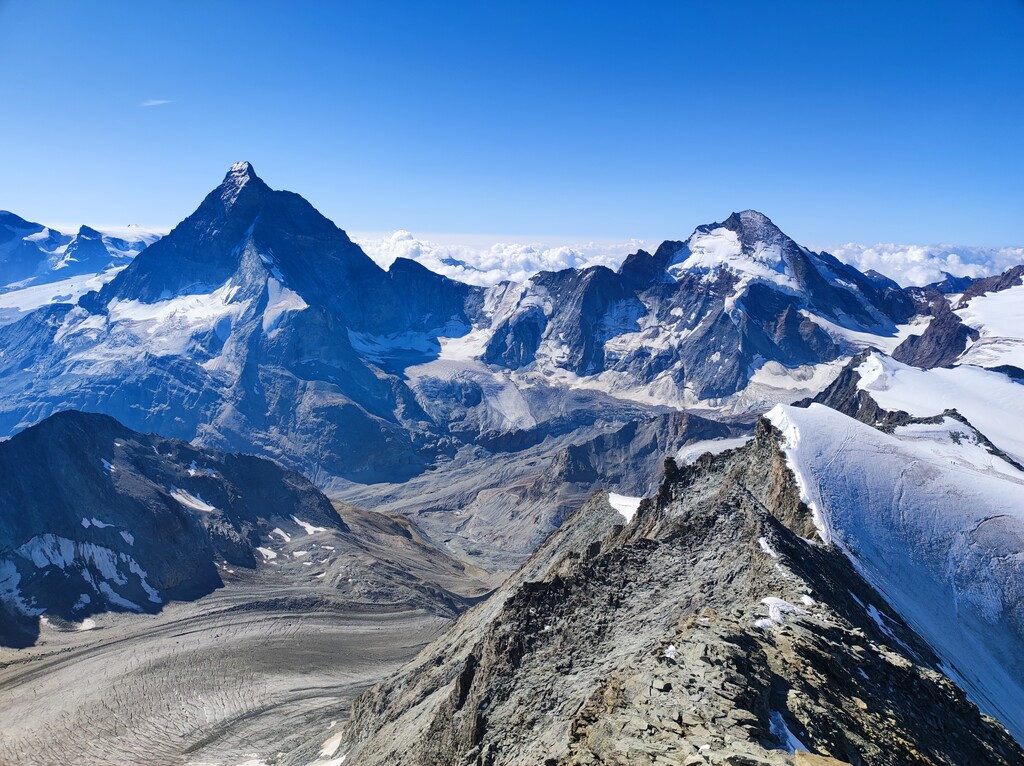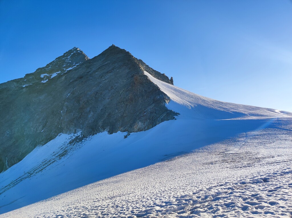 Once you have reached the Cabane de la Dent Blanche at 3500m the remaining 850m of elevation gain are more technical. You need to cross some snow and glacier before you reach the final rock ridge. Hundreds of crampons have eaten their way into the rock and the preferred route can be deduced quite easily from their scratch marks. The exposure and the need for precision are quite constant, but the climbing feels solid and engaging. It’s a route that demands your full presence, and the effort is its own reward. Most people go in rope teams and rappel on the way down, which can make for quite some