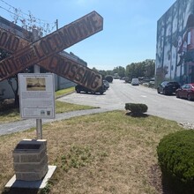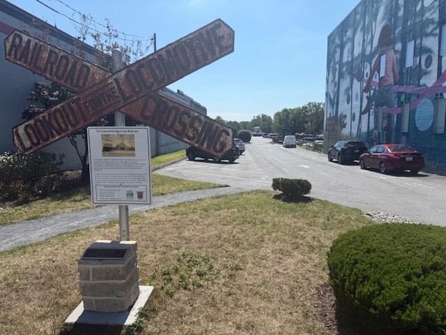 Around the 800 block of Frederick Road, you will cross Mellor Ave. (This is just under a mile from the #8 Streetcar Path.) The Catonsville Fire Station will be on the left as you cross Mellor. Just past the corner building on your right, and directly across the street from the Fire Station, turn right and you will see the big old Railroad Crossing Sign marking the trail. A big mural will be on the side of the building to your right.