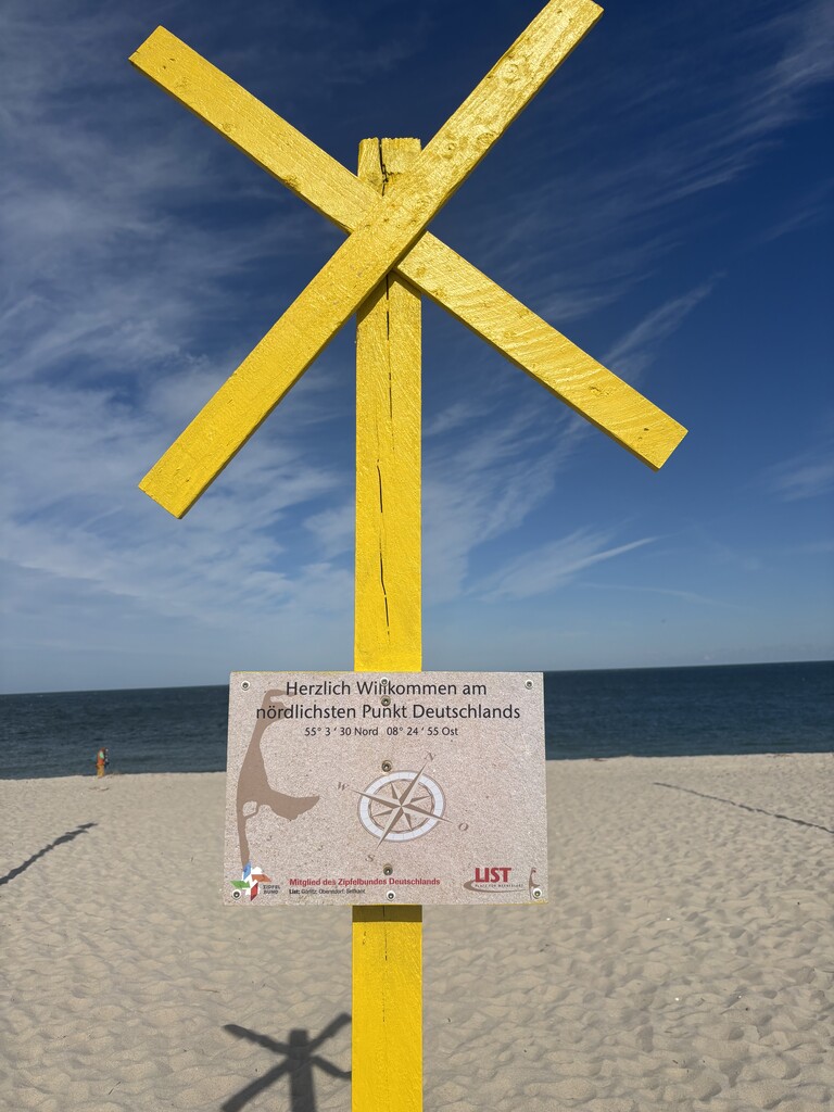 The finish is at the northernmost point of Sylt, which is also the northernmost point of Germany. It is clearly marked by an information sign and a series of posts/poles that denote the location. While the coastline continues eastwards due to the island’s curvature, no land extends further north beyond this point – making it an unmistakable and logical finish for the route.