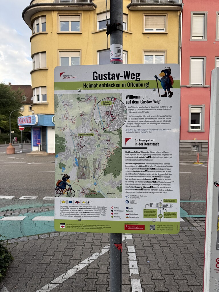 Lust, zu Fuß oder mit dem Rad auf Entdeckungsreise zu gehen? Dann ist der Gustav-Weg genau das Richtige! „Gustav“, das sympathische Maskottchen der "Heimattage Baden-Württemberg Offenburg 2022" zeigt auf dem Erlebnisweg die Freiheitsstadt von ihren schönsten Seiten. Auf einem knapp 48 Kilometer langen Rundkurs verbindet er die pulsierende Kernstadt mit ihren reizvollen elf Ortsteilen.