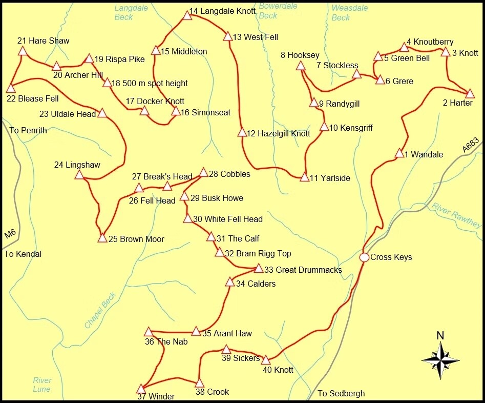 It was first completed by Tony Wimbush and Colin Brooke in April 1985 in 11-58 starting from the Cross Keys on the A683, north-east of Sedbergh. It covers over 60 km with some 3500 metres of ascent.