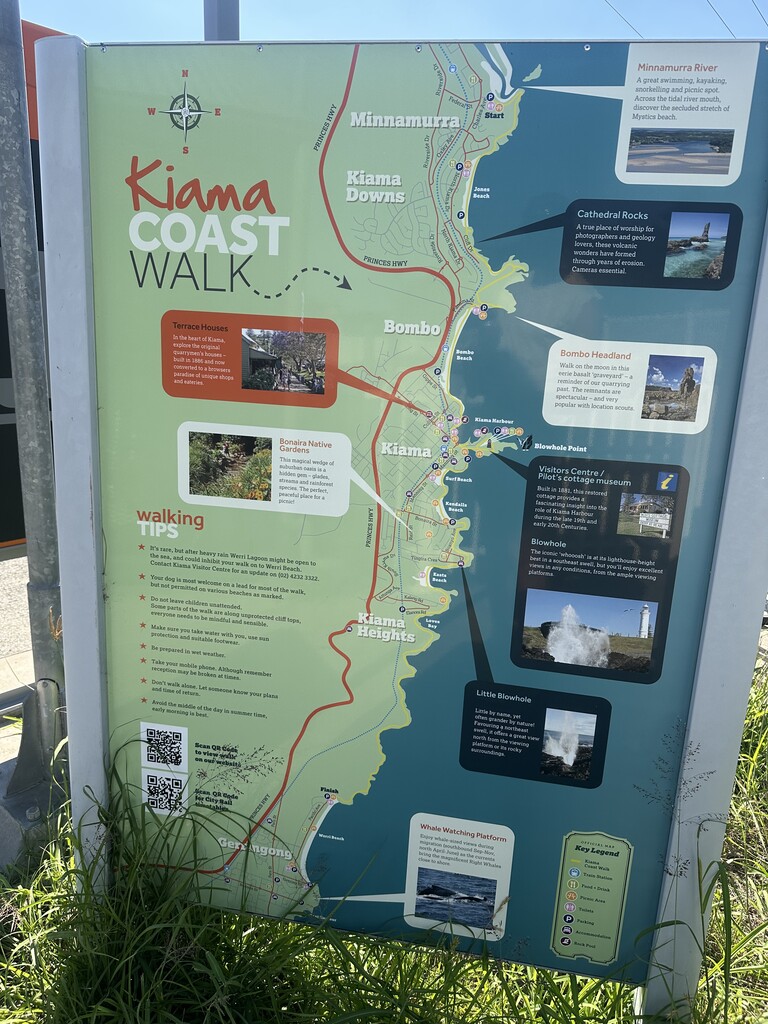 The Kiama Coast Walk follows the officially signposted coastal walking track from Minnamurra train station to Werri Beach lagoon along the coastline, remaining on the marked trail wherever possible.