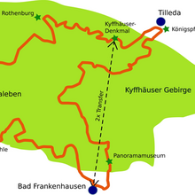 Location Germany Distance 37 km Vertical Gain 1,100 m Description Auf 37 Kilometern führt der Kyffhäuserweg durch offene mediterrane Karstlandschaften, menschenleere Buchenwälder, duftende Streuobstwiesen und viele Sehenswürdigkeiten. Schöne Trails an Berghängen. https://www.naturpark-kyffhaeuser.de/kyffhaeuserweg.php GPS Track t28034667_kyffhaeuserweg.gpx114.02 KB FKTs Standard route Images Log in or register to post comments