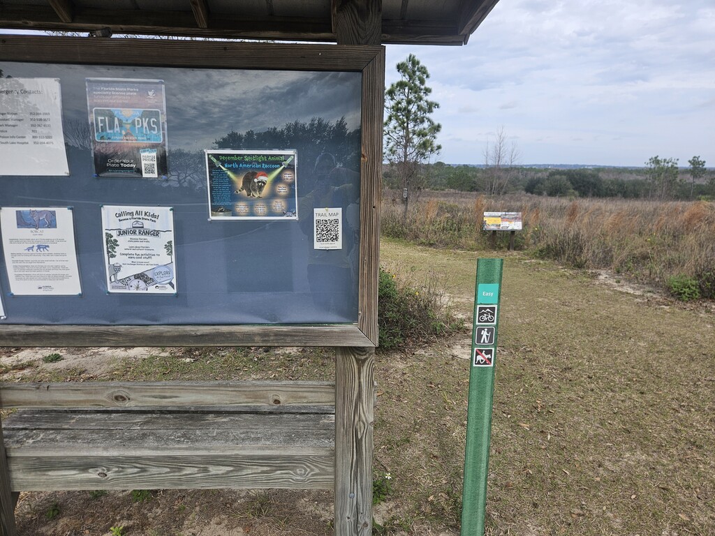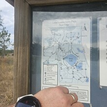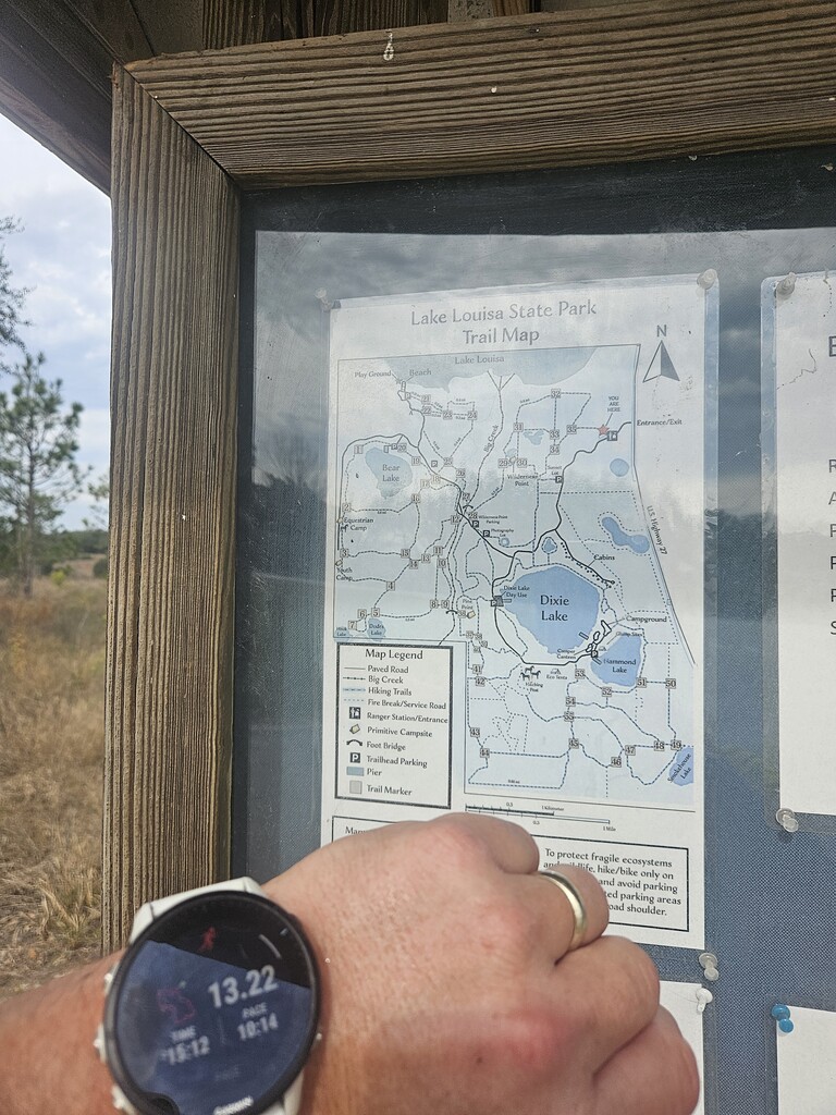 Multi-use trail that traverses the perimeter of Lake Louisa State Park in Central Florida. A mixture of single-track, forest roads, a couple actual road crossings, and lots of sugar sand. Great views of the state park though limited shade throughout. After you hit mile 10 there are a series of hills over the next 2 miles (decent incline considering it's Florida). There are some equestrian facilities in the park so there are frequent piles of horse you know what along the way, but the trails are generally wide enough to avoid. You also get to run by the camping lodges and two of the primitive campsites on offer in the park.