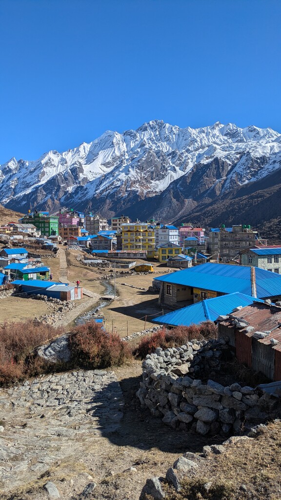Doodle Baseball The Langtang Valley Trek is a ~60 km route in Nepal with about 3,600 m of vertical gain. It starts in Syabru Bensi (1,500 m) and follows a narrow valley through jungle and rocky sections before opening into alpine yak meadows and reaching Kyanjin Gompa (3,870 m). The first 15 km are steeper with many ups and downs near the river, while above 3,000 m the trail becomes more open and scenic. It can be done as either a continuous ascent/descent or split into up and down segments.