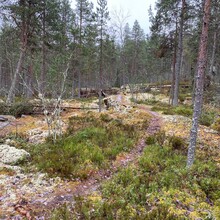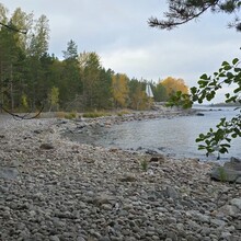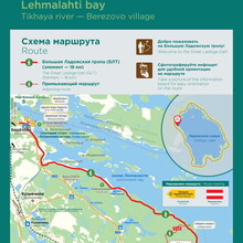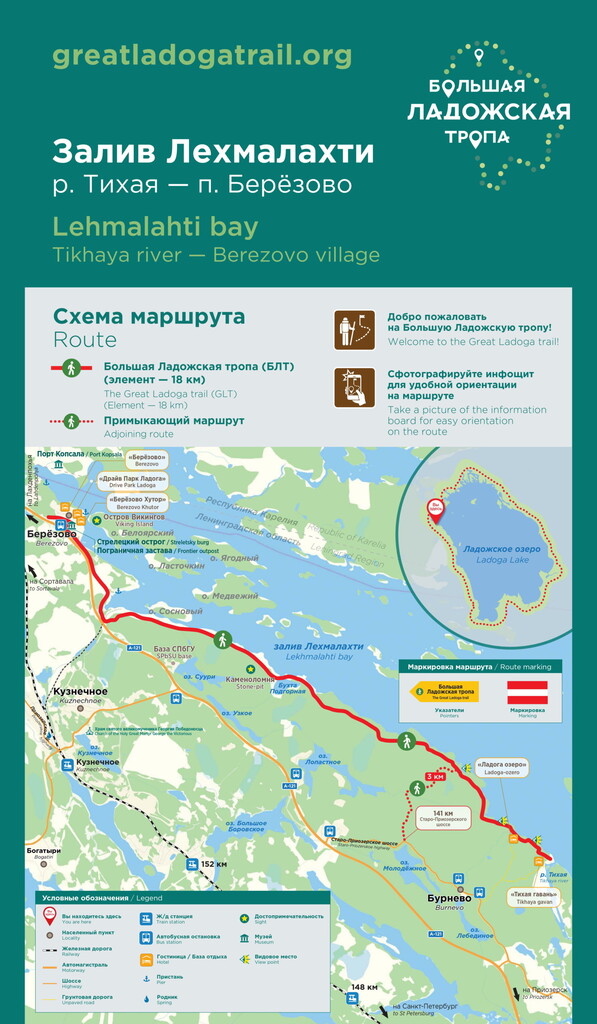 Route starts from the place where Tikhaya river meets Ladoga lake. First 13 kilometers the trail is okay only for hikers. Walking is okay, but stony ground and twisty line makes impossible using mountain bike, etc. After 9km point track goes to the viewplace on the top of the hill — highest pont far around. While going up and down here gps-track will be very usefull. Last 4 kilometers consists different roads to the center of Berezovo village. End of the route — sign of Lehmalahti trail near "Zastava" museum&cafe.