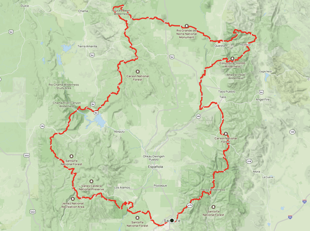 Starting and ending at the Santa Fe Plaza, the loop winds through many of the most beloved hiking trails in northern New Mexico. Hikers are taken through high desert pine forests and mountains over 10,000 feet in elevation, through deep canyons and arid farmland, and over stunning mesas. The route passes through iconic locations including the Jemez, Ghost Ranch, near Chama, Questa, Taos Ski Valley, Red River, Eagle Nest, Angel Fire, Sipapu, and the Pecos Wilderness, plus Bandelier National Monument with its ancestral pueblo dwellings and rock images. The cultural richness is unmatched, with arguably the best food available for any long hike available in Santa Fe, along with the city's rich history and vibrant art scene. The Rio Grande features prominently in the grand scheme of the hike, and the route offers a very respectable number of trail miles rather than being primarily road walking like some alternative routes.