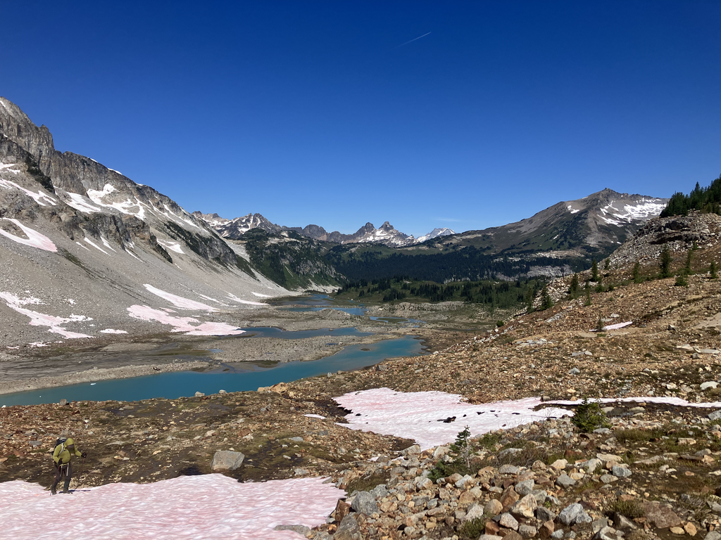 Considerations for the time of year and direction. I hiked this route clockwise, and I would recommend that direction for the progression of scenery. It was a magical experience to hike down the spider glacier to reach Larch Knob with it’s magnificent larches and views of Spider Meadow. However, hitting the Chiwawa River later in the route so that you only have to hike with wet feet for a few miles as opposed to our 27 would be nice. Then again, the river is a good one to hit early in the morning when there’s not much snowmelt happening. Overall, the challenges of this route (water crossings, Spider Glacier, mosquitoes) diminish a lot through the summer. By fall, the wildflowers are gone, but replaced by golden larches and scarlet huckleberry fields.