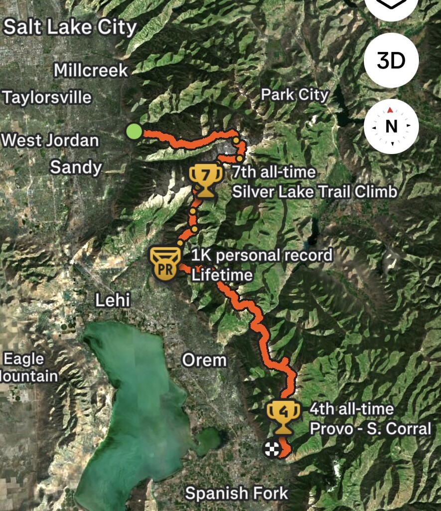 Location Utah, US Distance 73 mi Vertical Gain 49,000 ft Description A linkup of the Wasatch Ultimate Ridge Linkup, the Alpine Ridge Traverse, and the Provo Ultimate Ridge Linkup. In the Wasatch Mountains of Utah. https://loganwagnerblog.blogspot.com/2025/10/triple-ultimate-ridge-linkup-turl.html GPS Track Night_Trail_Run_0.gpx26.81 MB FKTs Standard route Images Log in or register to post comments Comments Tracking says 73.03 miles and 48,973 feet of gain. Depending on route-finding, I estimate it to be 65-75 miles and 45,000-50,000 feet of elevation gain. Log in or register to post comments