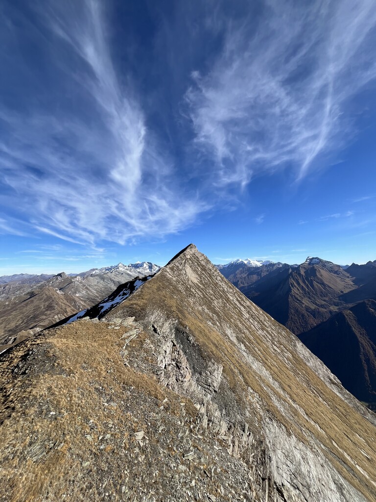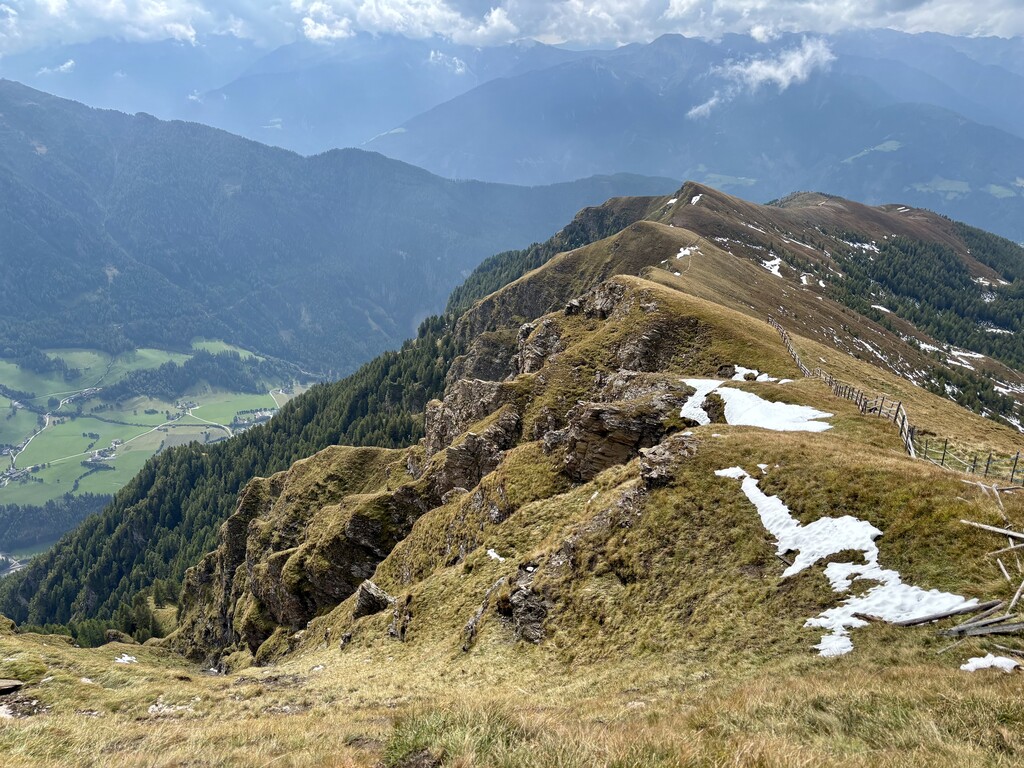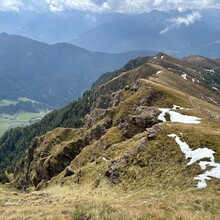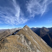 The route follow the logical path of the ridge between the Wipptal valley and the Pfitsch valley. It covers about half of the ridge "Tuxer Hauptkamm", itself part of the Zillertaler Alpen. Climbing Saun, Riedspitze, Weißspitze, Amthorspitze (Hühnerspiel), Rollspitze, Kalkwandstange, Flatschspitze, Wolfendorn, Wildseespitze and Kraxentrager (being the highest point at 2999m) in the process. After Kraxentrager the trail does not continue on the ridge hence the routes then goes down to the Brenner pass. Roughly 6 km directly follow the border between South-Tyrol, Italy and North Tyrol, Austria and thus lie on the Alpenhauptkamm. The trail is mostly hike- and runnable, some spots require easy climbing and/or are secured with ropes. Routefinding can be challenging, as the route is not particularly popular.