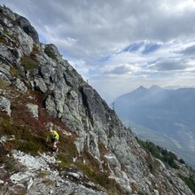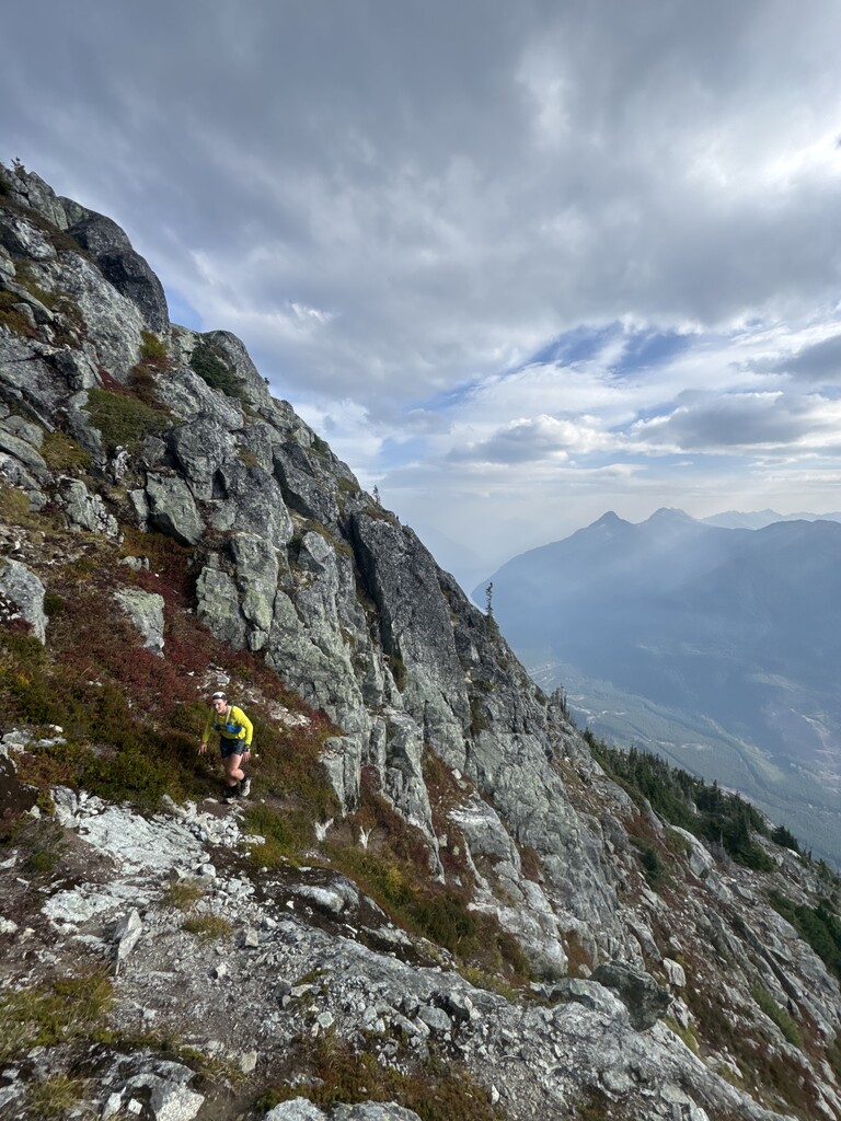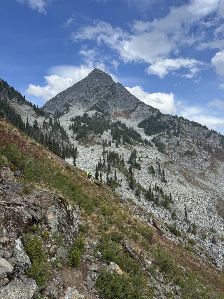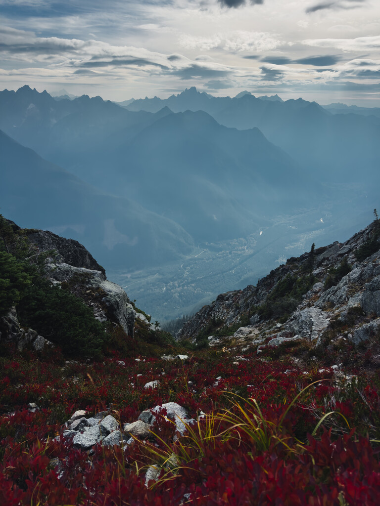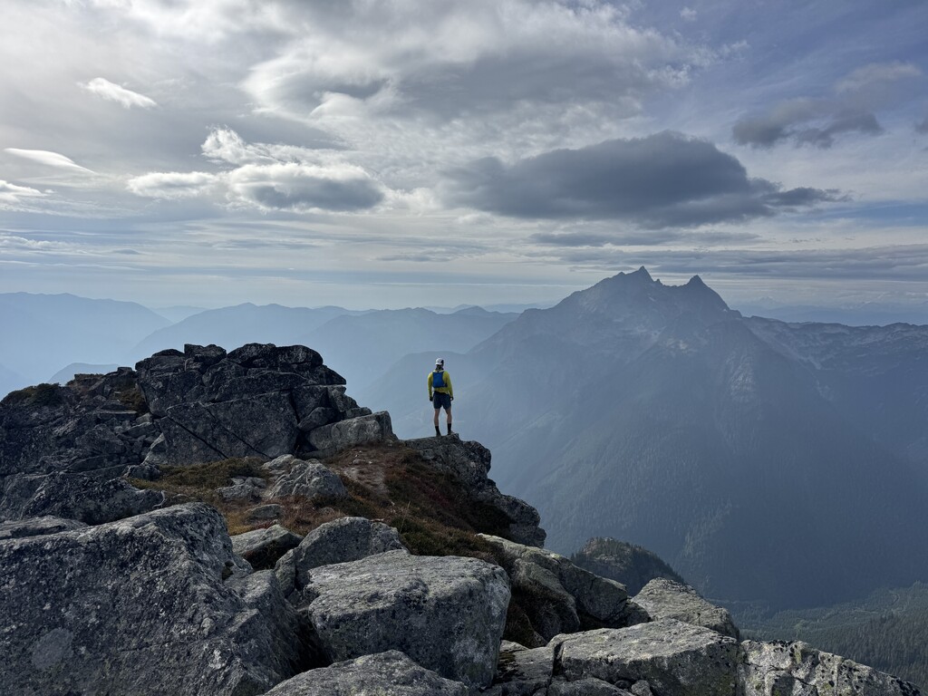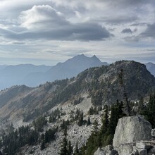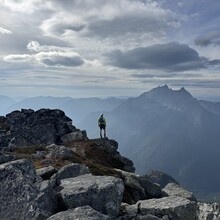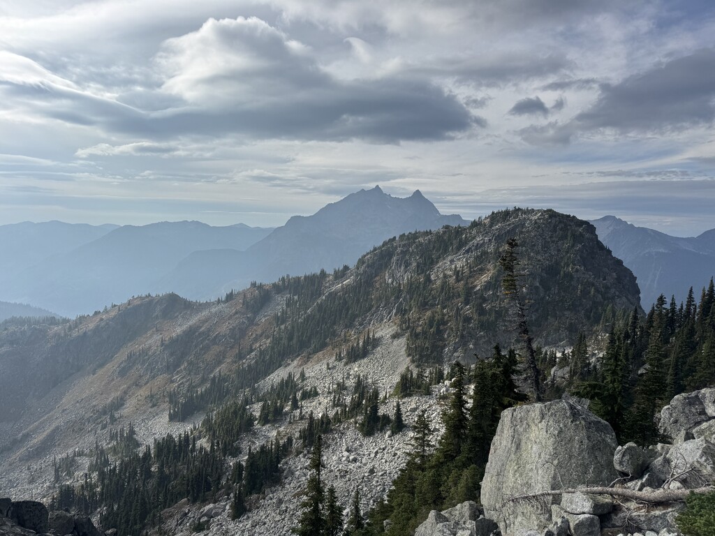 At the end of the boulder field a loose, steep gully leads into another south-facing grassy gully, which provides the final access to the summit. The ridge to the left goes at about class 3, but the gully provides the easiest and likely fastest route to the summit. Views from the summit are panoramic, with unfettered 360 views around the entirety of the Chilliwack range.